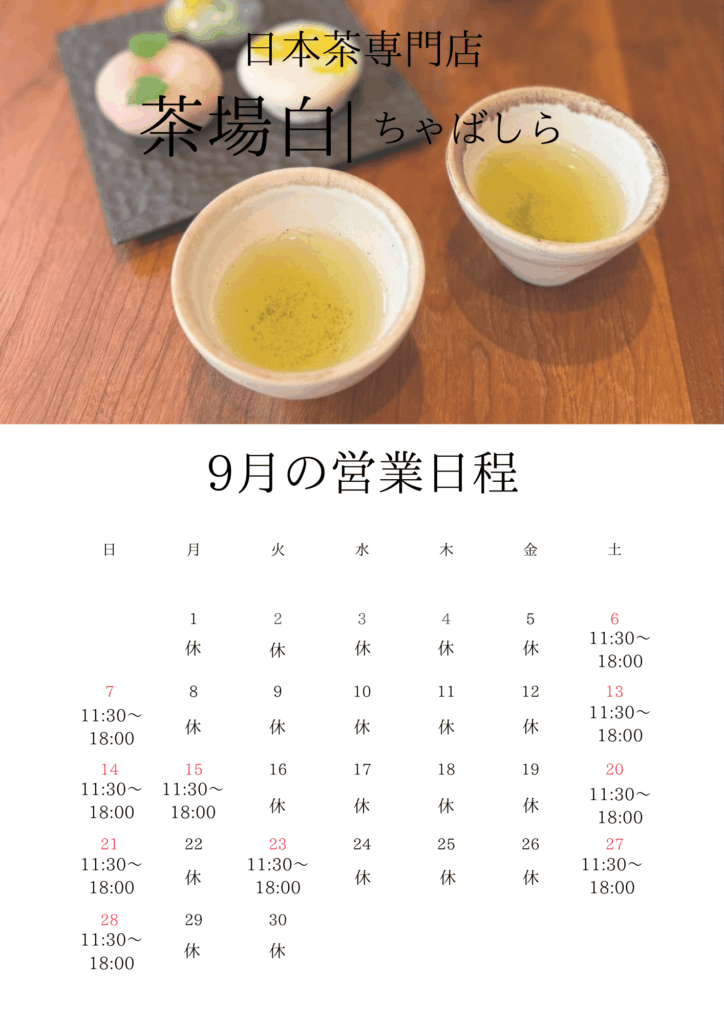 9月の営業日 2025.08.30 営業日 9月の営業日程を更新しました! まだまだ暑い日が続きますが、秋らしい風も吹き始めました。 気候やご気分に合わせて日本茶を楽しんでください! 来月もよろしくお願いいたします。 冷茶で暑い夏を乗り切りましょう! 前の記事 10月営業日 次の記事